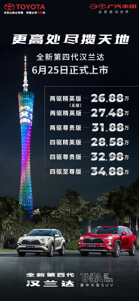 更高处,尽揽天地!今日,广汽丰田TNGA豪华大型SUV全新第四代汉兰达正式上市。作为率先开辟豪华大七座SUV市场的全球战略车型,汉兰达已走过21年光辉历程,全球销量超445万台。近年来,随着汽车“新四化”浪潮汹涌而来,作为国内最早实现电动化车型量销的企业之一,广汽丰田一直积极响应国家新能源发展政策和碳达峰、碳中和目标,持续导入全擎动力新技术,致力实现车型全面电动化。依托丰田TNGA架构和先进混动技术的双重加持,全新第四代汉兰达的到来,将强势拉开广汽丰田电动化时代的又一崭新序幕,引领豪华大型SUV新浪潮。新车推出2.5L双擎两驱和四驱共6大配置版本,厂商建议零售价26.88万-34.88万元。