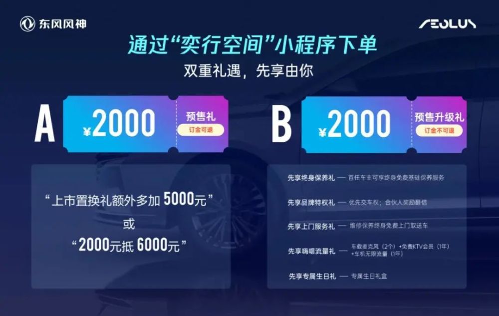 方案二:预售升级礼,交纳2000元不可退定金,除了享受方案一中的权益,还可额外享受包含终身免费保养在内的五重先享大礼。