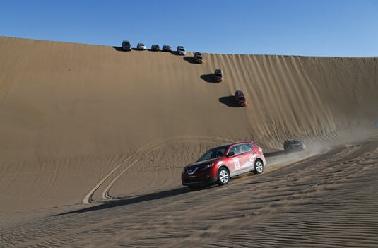 东风日产全国媒体越野挑战赛在敦煌鸣沙山以西、罗布泊以东的无人区进行。这片亘古荒凉的无人区,囊括沙丘、戈壁、河床、沙谷、河流等中国最齐全、最严苛的极限越野地形,云集黄沙、蓝天、白云、烈日、胡杨等中国最美的极限沙漠风光。新奇骏也以一次漂亮的全地形征服,尽显城市SUV的极限越野性能,展示了挑战不可能的极限精神。