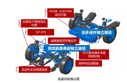 全新思铂睿的前悬架采用了全框式的副车架搭载高性能滑柱式麦弗逊式独立悬挂,SFRD减震器(频率响应减震器)、发动机空气负压调节支架、Dual Pinion-EPS转向机构、减震器横向稳定杆、下摆臂液压衬套等领先技术。后悬架则采用了复合多连杆式独立悬挂,封闭梁全框式高强度副车架与各个控制臂都是用衬套连接。前后整体全框式高强度副车架通过前后共8个液封衬套与车身悬浮连接,有效抑制了来自路面的激励和来自发动机的振动,为驾乘者提供了非一般的平稳感和舒适感。