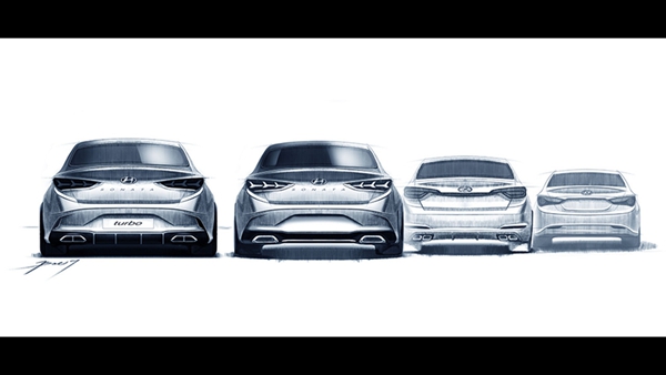 现代脸谱官方网页近日发布了2018款索纳塔改款车首张设计草图。该车将于今年晚些时候发布。这张草图不仅展示了运动版和标准版,而且上两代车型也同时在列。从图片看,新车外观更具侵略性,不过在最终量产版上,锐利的线条将被更保守的设计所取代。不过运动版的四排气尾管仍将保留,新车与现行版一样将搭载1.6和2.0升涡轮增压引擎。至于车头部分,仍将保留“cascading”格栅,两侧是更顺滑的前大灯。与最新一代i30一样,索纳塔轿车也将采用垂直LED日间行驶灯并与保险杠集成在一起。现行版索纳塔搭载的2.0升涡轮引擎功率183千瓦/245马力,搭配前轮驱动和七速双离合自动变速器。先前有报道称,新车将与i30N共享新的2.0升涡轮引擎。坊间传言称功率将提升至194千瓦/260马力,这将使新车加速性略有提升。有媒体猜测,现代将在4月纽约车展发布2018款索纳塔。