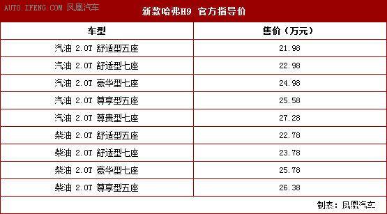 日前,哈弗汽车官方宣布新款哈弗H9正式上市,新车提供包含汽油版和柴油版在内的共计9款车型,售价为21.98-27.28万元。具体售价详见下表: