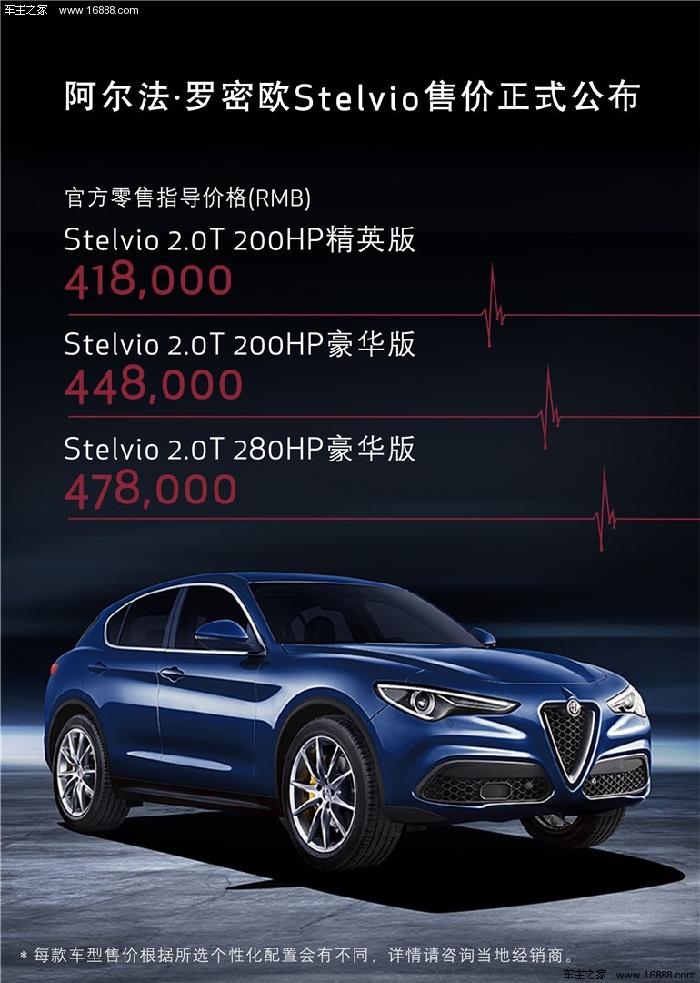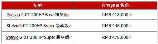 阿尔法·罗密欧全新进口Stelvio豪华SUV的官方建议售价为: