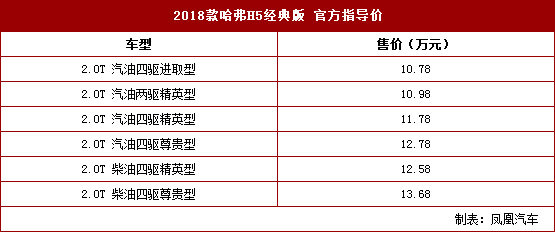 8月4日,2018款哈弗H5经典版正式上市,新车在造型上更显年轻与运动,引入了Carlife手机互联、DTS音效等时下流行配置,搭载2.0T汽油及绿静2.0T柴油发动机,售价区间为10.78-13.68万元。具体售价详见下表: