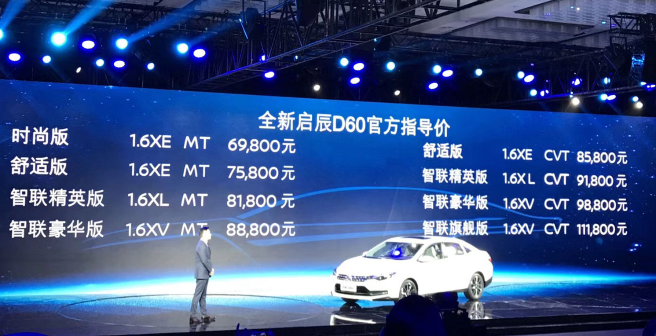 11月2日,东风启辰旗下全新轿车D60正式上市,新车先期推出1.6L动力版本,共计8款细分配置车型,指导价6.98-11.18万元。
