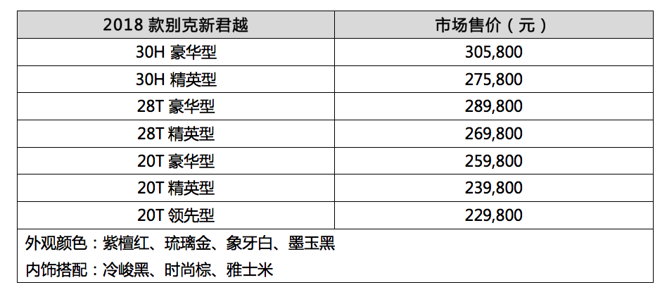 2017年11月17日 今天,上汽通用汽车别克品牌正式发布由君越Avenir领衔的2018款别克新君越,包含Avenir、30H、28T、20T四大系列共8款车型,售价区间22.98-30.98万元。作为别克高端子品牌Avenir的最新力作,君越Avenir定位于君越车系的高端,通过更个性、更精致的设计和细节,以及尊贵专属的“别克关怀”服务来引领传统轿车的细分化发展,满足用户不断升级的汽车消费需求。同时,2018款新君越引入别克最新eMotion智能驱动技术,Avenir和28T车型全面配备9速Hydra-Matic智能变速箱,升级新一代eConnect智能互联系统,并将eProtect智能安全科技配备到全系60%车型上,继续为当代社会中坚带来“不同凡想”的驾乘体验。