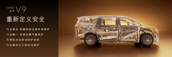 安全是最大的豪华。行业首创的颠覆性电磁热控压铸车身部件,车身强度大幅提升,解决传统MPV第三排最薄弱的安全隐患,真正实现座座安全平权。行业唯一全维包裹安全气囊,全方位守护头颈胸等关键部位,带来“金钟罩”般的安全保护,七重联动防护构筑从头至臀的立体防护网。天使座主动安全防护系统,可在碰撞前二三排靠背主动回位,提前预判风险,防患于未然。并配合潜艇级热成型钢三排核心骨架、三排超长侧气帘和侧气囊,打造行业最充分三排全向保护。智界V9凭借硬核车身、颠覆性压铸技术、13个安全气囊等技术,重塑高端旗舰MPV安全价值标杆。