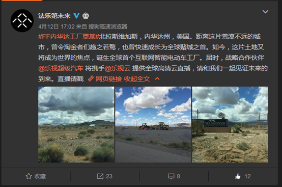 在今年1月的CES展上,FF首款概念车FFZERO1成功亮相,引发了全球媒体的巨大关注。与此同时,FF建厂计划也一直牵动人心。近来,Faraday Future在社交媒体上连续爆料,显示工厂奠基“好事将近”。