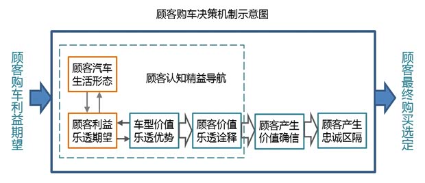 从决策产生机制的角度考察,顾客购车决策实际上是顾客为自己的汽车生活期望寻找最佳解决方案的过程;是通过信息认知、体验、评估,对以车型乐透优势为核心的车型价值形成信·望·爱的过程。
