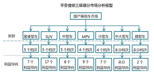 平 安信德经过8年研究,建立起类别-档次-利益导向三级细分市场分析模型,将国产乘用车划分为7个类别、25个档次、51个利益导向市场。在《第一势》里, 对51个利益导向市场的顾客人群结构、顾客购车需求、车型竞争格局、车型创新焦点进行系统的分析论述。以它作为车型竞争分析的GPS系统,可以准确辨别出 备选车型、标杆车型、同类竞争车型、替代竞争车型。