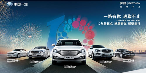十年品质,十年相伴。一汽奔腾经过十年“进取不止”的拼搏与奋斗,形成了覆盖中高级轿车、中级轿车、A级轿车和SUV车型的强大产品线,实现了从无到有、从小到大、从单一到多元的发展征程。十年是一次蜕变,十年为了更好的成长,未来还有更多精彩,感谢十年相伴!让奔腾更有信心继续秉承“进取不止”的品牌精神,不断提升品质与客户满意度,为广大消费者打造更加精彩的用车生活,持目以待一汽奔腾荣耀之旅“回归”新的梦想起点!