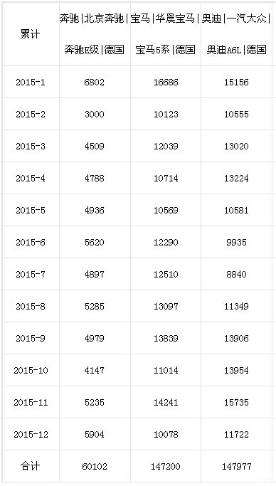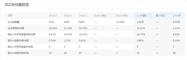 奔 驰在国产豪华中高级车市场与老对手宝马、奥迪的差距到底有多大?来自相关部门的统计数据显示,奔驰E级在2015年的总销量为60102辆,虽然相比 2014年的43708辆有了明显提升,但距离宝马5系Li的147200辆、奥迪A6L的147977辆,依然有着不小差距。除了在中高级车市场表现一 般之外,奔驰品牌在豪华中型SUV市场的表现也不能让人满意。看起来不乏卖点的GLC,其在今年前3个月的总销量仅为16217辆,而主要竞争对手奥迪 Q5则高达32812辆。GLC不温不火的市场表现,也让小猫不得不为全新E级长轴距版的市场前景感到担忧。