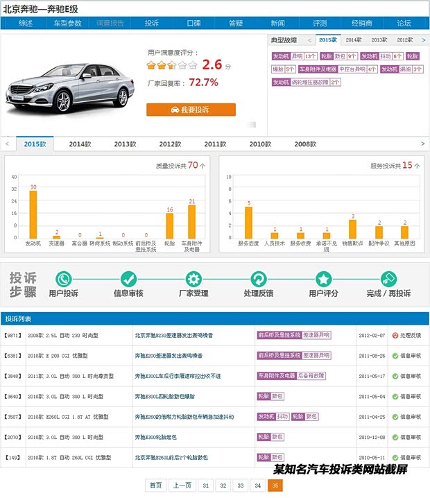 除 了修车贵之外,可靠性差、故障多,也成为困扰奔驰车主的大问题。在2015年,奔驰召回次数高达12次,E级更是因为同一问题被召回两次。登录汽车投诉类 网站,您可看许多有关E级或奔驰品牌的质量投诉。当修车贵遇上故障多,普通消费者在选择的时候自然要多考虑一番,即便是奔驰品牌在中国市场有着不错的认可 度。