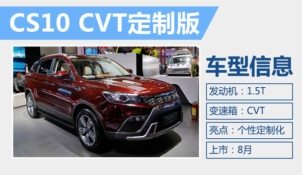 推出定制版车型的同时,CS10还将新增1.5T+CVT动力组合的新车型,搭载三菱代号为4A91T的1.5T涡轮增压发动机,匹配比利时邦奇CVT无级变速箱,燃油经济性将比现款2.0T车型得到提升。加之现款CS10 DCT版,CS10的家族阵容更加完善。