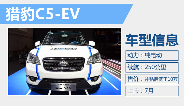 除CS10 CVT定制版车型外,猎豹年内最重磅的车型当属C5-EV,作为猎豹品牌的第一款电动SUV,新车在续航里程方面十分出众,综合工况下可以行驶250公里,与目前市场上销售的主流电动车不相上下。网通社从猎豹汽车官方获悉:即将上市的C5-EV基于飞腾C5汽油版打造,7月底上市后的售价在10万元以下(补贴后售价) ,年内目标销量3,300辆。