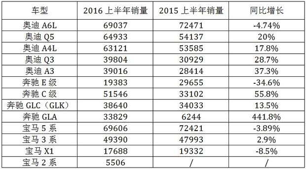 1、得益于中国市场的SUV红利,在SUV区间内,三大品牌除了宝马外,都有不错表现。其中增长最为强势的区间在入门级别上,不仅是奔驰GLA获得了极大成功,奥迪Q3增势也很凶猛。宝马X1刚刚进行了换代,可望在下半年划出一道触底反弹的曲线。