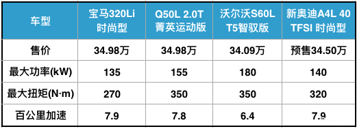 从豪华中型车的2.0T主力产品对决的数据看,宝马320Li、英菲尼迪Q50L 2.0T、奥迪新A4L2.0T的百公里加速时间都在7.8秒、7.9秒之间。动力水平上宝马320Li和奥迪新A4L 40 TFSI的数据相对较弱,最大功率分别为135、140千瓦,最大扭矩分别为270、320牛·米,沃尔沃S60L最强,最大功率达到了180千瓦、最大扭矩350牛·米,最重要的是它的百公里加速达到了6.4秒。从官方售价35万元以内来看,它是四款车中最强的,这也是很多人印象中没有意识到的问题。实际上阿斯顿马丁、捷豹、路虎、沃尔沃在福特掌管的多年,都已经全部被注入了清晰的运动化基因,因此实际的驾控性能都属于强悍一族。而且考虑到实际售价其实这四款车,沃尔沃S60L T5、宝马320Li时尚版本已经杀到了28万元价格区间,英菲尼迪Q50L也有近5万元的优惠,目前看奥迪新款A4L上市之初短期内会是价格最高的。所以性价比角度看,沃尔沃S60L和宝马3系Li会保持一段价格优势。