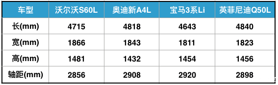 四款车型中新款奥迪A4L的前脸极富攻击性,年轻化潮流相当明显,宝马3系Li和英菲尼迪Q50L一直带着强烈的运动风格,因此极受年轻人喜欢,沃尔沃S60L在造型上显得较为平和,没接触的话很容易忽视其运动车型的真相,但开过S60 L T5版本的用户会发现它实际上相当生猛,虽然四款车中最扮猪吃老虎的那一个。