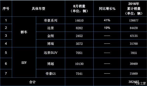 轿车:新帝豪销量为14610辆,远景轿车当月销量为8282辆,B级轿车博瑞8月销量依旧稳定,为3572辆;金刚销量2452辆。