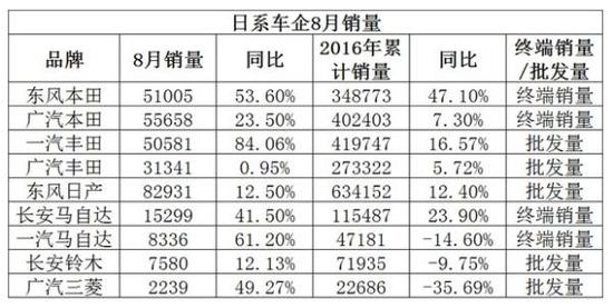 分析认为,广汽本田、东风本田、一汽丰田、广汽丰田以及东风日产均拥有较为完善的产品线,可覆盖大部分国内主力细分市场,这是保证较高销量增速的一个重要原因。