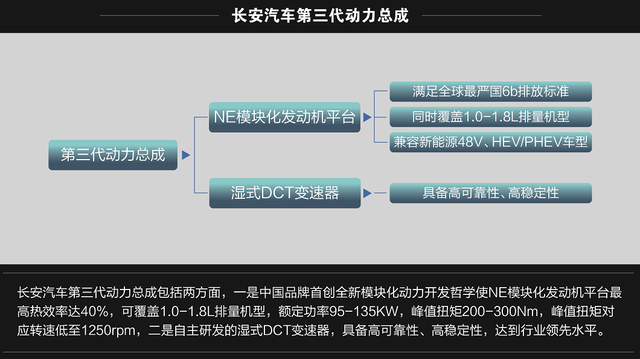 长安在中国品牌中首创全新的模块化开发哲学,使NE发动机平台可覆盖1.0-1.8L排量机型,额定功率95-135KW,峰值扭矩200-300N· M,峰值转速对应低至1250rpm,最高热效率40%。相对非平台化产品,通用化率最高提升87.5%,实现唯一平台满足多个机型生产,且平台化产品在尺寸和重量上最优,处于国际领先水平。