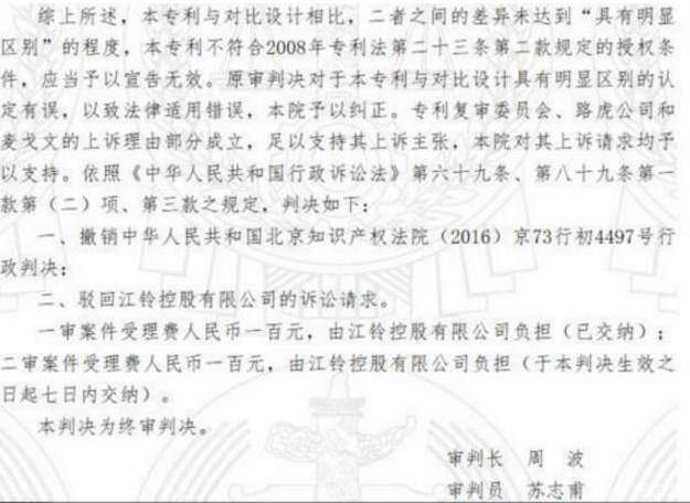 这类小商品的案例逻辑摆在路虎和陆风和纠葛面前,似乎没有违和感。但可能由于汽车这一产品的特殊性和行业复杂的业务关系,整个诉讼案历时三年,直到2019年3月份北京朝阳区人民法院判定:“江铃控股旗下的汽车品牌陆风X7车型有5项车型设计侵犯了路虎揽胜极光的设计”;判决:“陆风X7车型应当立即停止生产、销售以及营销推广,向捷豹路虎公司赔偿共计150万元”。