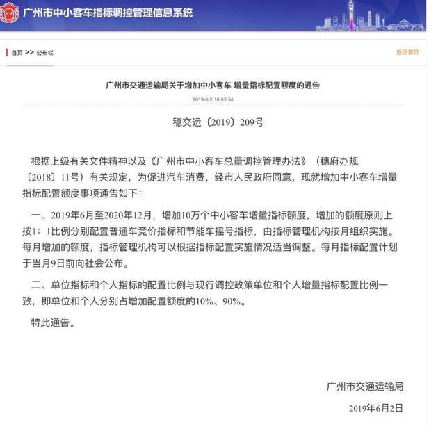 根据广州市交通运输局发布的通告,从2019年6月至2020年12月,增加10万个中小客车增量指标,增加的额度原则上按1:1比例分别配置普通车竞价指标和节能车摇号指标,即在此期间广州节能车增量指标将新增5万个。
