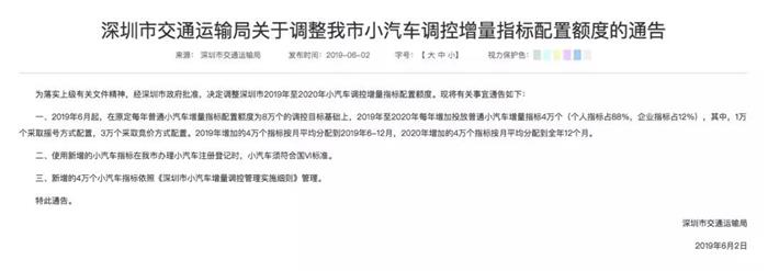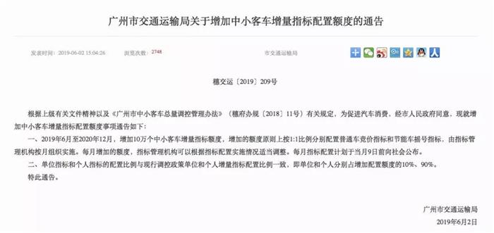 其中,广州市将在2019年6月至2020年12月,增加10万个中小客车增量指标额度;深圳则将自2019年6月起,在原定每年普通小汽车增量指标配置额度为8万个的调控目标基础上,在2019年至2020年每年增加投放普通小汽车增量指标4万个。