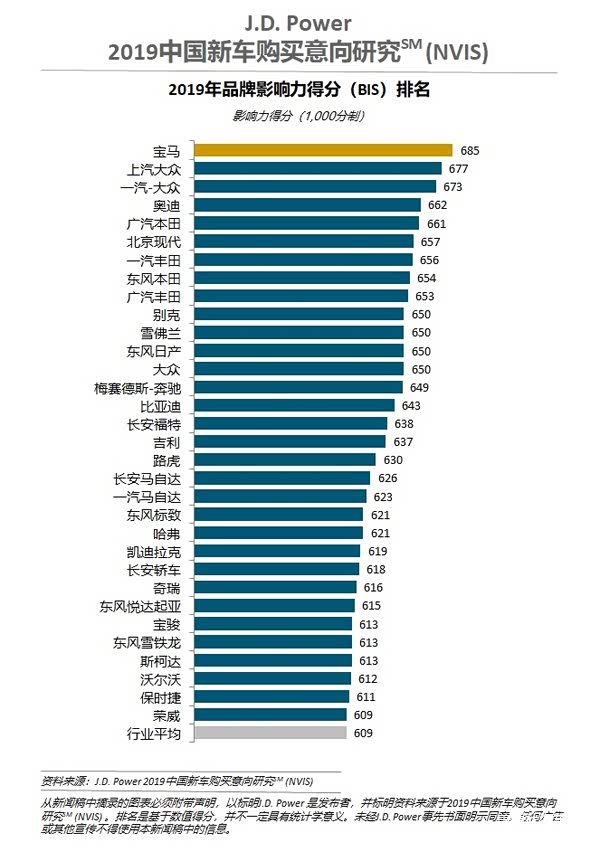这项研究还包括品牌影响力评分 (BIS) ,品牌影响力得分(1,000分制)衡量汽车品牌在中国意向购车者中的熟悉度和喜好度。宝马(685分)的品牌影响力得分最高,其次是上汽大众(677分)和一汽大众(673分)。