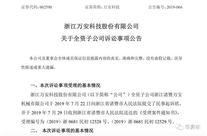 7月29日,万安科技(002590)发布公告称,公司全资子公司浙江诸暨万宝机械有限公司(下称“万宝机械”)于2019年7月22日向浙江省诸暨市人民法院提交了民事起诉状,要求力帆股份(601777)旗下子公司重庆力帆乘用车有限公司(下称力帆乘用车)、力帆乘用车北碚分公司支付约607.57万元货款。