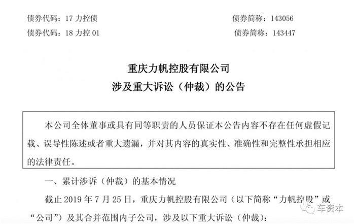 7月29日,力帆股份再度发布公告,披露截至2019年7月25日,力帆控股及其合并范围内子公司涉及的重大诉讼(仲裁)。力帆股份称,目前所披露的诉讼(仲裁)案件大部分尚未开庭审理,因此暂时无法判断对公司本期利润或期后利润的具体影响。