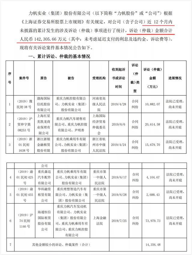 除了万安公司起诉要求付款的607.57万货款,对于力帆来说,更大的债务危机还在后面,还有更多的公司、金融机构对力帆进行诉讼仲裁,近12个月内未披露的累计金额高达14.23亿元,可见力帆的债务危机有多大。
