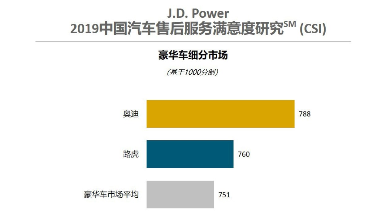 奥迪以788分位居豪华车细分市场售后服务满意度榜首。路虎以760分排名第二。