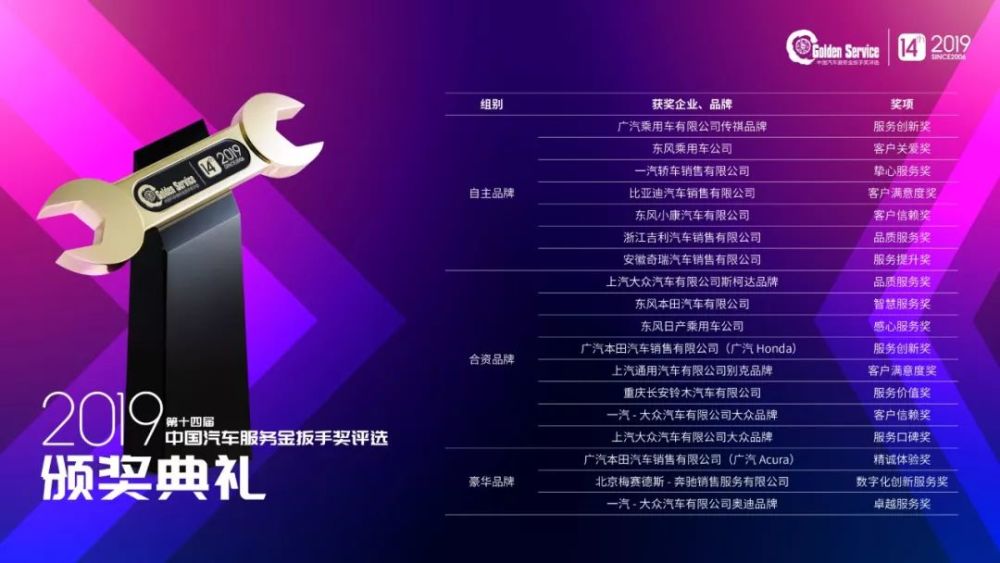 2019年,“中国汽车服务金扳手奖评选”迎来第14个年头,主办方推出了一系列创新活动,包括“3•15”车企诚信服务联合声明发布、汽车新享会、数字化服务测评系列专题、2019全国十佳金扳手“精工巧匠”精英钣金技师评选、车企数字化服务调研报告,以及2019金扳手服务体验店等活动。
