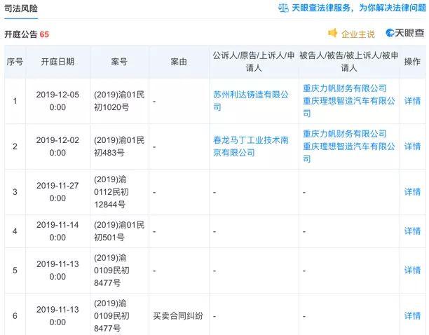 根据天眼查上的公开信息,在司法风险一栏,目前重庆理想智造共有65条开庭公告,其中有57条是发生在今年,“被告人/被告/被上诉人/被申请人”虽然是更名之后的重庆理想智造,但是案子中的协议都是“力帆汽车”时期力帆和供应商们签下的。