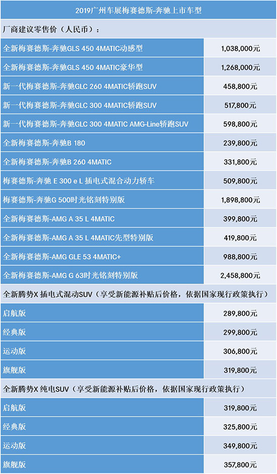 值得关注的是,本届广州车型,梅赛德斯奔驰同时上市9款车型。其中,作为首款“中国制造,专属中国”的AMG车型,全新梅赛德斯-AMG A 35 L 4MATIC共带来全新AMG A 35 L 4MATIC及全新AMG A 35 L 4MATIC先型特别版两款上市车型,售价分别为39.98万元和41.98万元;首款凝聚“梅赛德斯-奔驰 型·格”的量产车型,全新腾势X插电式混动SUV补贴后售价为289,800元-319,800元,纯电SUV补贴后售价为31.98万元-35.78万元;全新GLS 450 4MATIC 动感型售价为103.8万元,全新GLS 450 4MATIC 豪华型售价为126.8万元;奔驰E 300 e L插电式混合动力轿车售价为50.98万元;梅赛德斯-AMG G 63 时光铭刻特别版,售价为245.88万元;梅赛德斯-奔驰G 500 时光铭刻特别版,售价为189.88万元;新一代GLC轿跑SUV售价为45.88万-59.88万元;全新B级运动旅行车——全新B 180及B 260 4MATIC售价分别为23.98万元和33.18万元。此外,近期上市的奔驰EQC,以及销量明星C级和E级等车型也得以亮相。