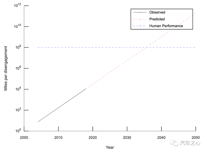 如果继续外推(红色线),总会有一天与指代人类驾驶能力的蓝色线相交。