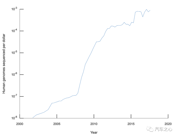 但到了 2008 年,基因测序迎来了全新技术,它彻底改变了基因测序的摩尔定律「系数」,进步曲线变得更陡了。原来 20 个月才能翻一番的性能,现在 4 个月就完成了。