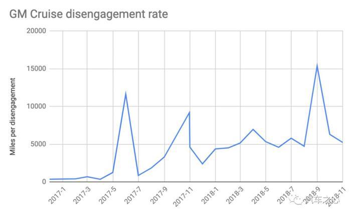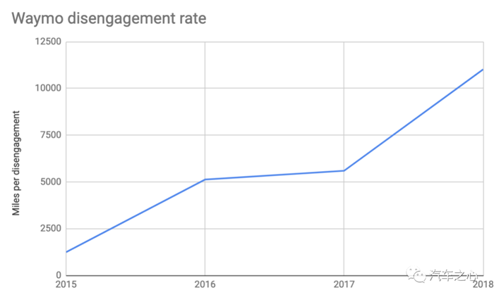 从图中蓝线可知,2017-2018 这一年 Waymo 自动驾驶系统性能成功翻番,但 2016-2017 年它的进步却相对平缓(2015-2016 年也进步神速)。