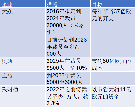 然而2018年欧洲乘用车平均碳排放量连续两年上升至120.4g/km,这对于竞争力比较强的德国企业来说,接受罚款是不能接受的,而且面对越来越严格的碳排放要求,使用有效的策略应对是必须的,否则这个“碳排的洞”永远补不完。而德国三家车企的主要策略,就是采用PHEV+BEV的战略来应对。我们看到在这波巨额的投资之前,德国车企首先根据这个拐点制定了系列的节流措施,主要是从之前的柴油机策略转型后,多出来的人员和资源需要优化,也就带来了如下表2所示的短期裁员计划。