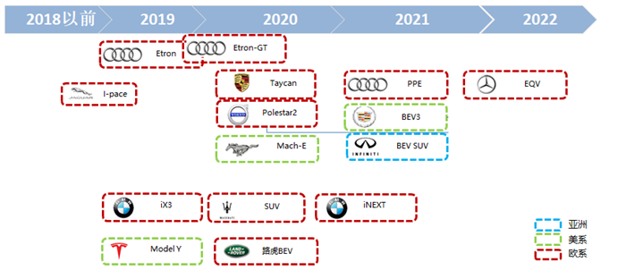 但是之前文章所谈到的,在纯电动领域里面,特斯拉的Model 3成为了爆款,不仅在电动汽车这个很小的细分市场超越对手,在美国的豪华轿车细分市场也是一骑绝尘。在Model 3的客户催化中,客户的来源是相对多元化的,不仅仅有原来购买入门&中级车的中年用户,还包括不少对科技偏好的(尤其在加州)年轻消费群体。关于Model Y切入的情况,如下图所示,大部分汽车车企都搞清楚了要在豪华电动汽车领域来做,基于续航里程和电池的特性,在SUV/CUV领域切入是个很好的点,一方面各个品牌也在大力推出、营造自己的环保减排的纯电动的印象,在智能化和辅助驾驶方面也在做大力的尝试。这动摇了德国汽车企业在原有豪华车里面的定义,想要转向纯电动,把话语权夺回来,不是一朝一夕的事情。