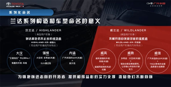 继第八代凯美瑞、C-HR和全新换代雷凌之后,广汽丰田TNGA家族迎来第四位新成员:威兰达WILDLANDER。 威兰达之所以备受关注,主要有两个原因:一方面,威兰达延续了明星车型汉兰达的高级车基因,具有高颜值、高性能、高品质、高保值、大空间等优势。 另一方面,威兰达基于TNGA-K高端平台全新开发,无论是平台、动力、四驱系统和配置,相比同级车型都更为优越,可谓天生高级。 作为广汽丰田全新TNGA中型SUV,威兰达致力创造具有高辨识度震撼魅力的造型和强健行驶性能的四驱SUV独有价值。其所拥有的“亦刚亦雅的外形、至美至能的座舱、游刃有余的驾控、全时响应的智联”四大领先优势,将使威兰达成为新时代富于探索精神的“领势开拓者”的理想座驾。