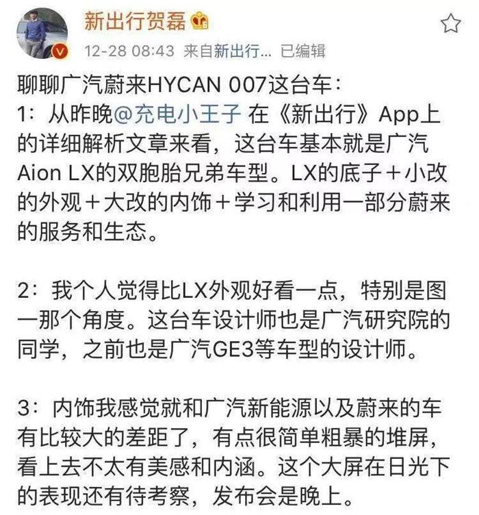 贺磊指出,1:HYCAN007和广汽Aion LX相似度极高,可谓双胞胎兄弟车型,LX的底子+小改的外观+大改的内饰+学习和利用一部分蔚来的服务和生态;2:内饰设计过于简单,没有设计美感度堆屏,没有内涵;3:和LX车型出自同一平台,续航破500km,比较扎实;4:内饰设计中加入模仿nomi的智能助手,山赛感强烈,整体用料的精致度不高;5:预售价套路和LX相似,正式售价或将重叠LX。