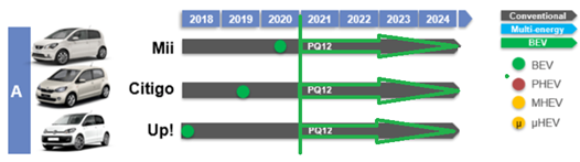 其中,大众集团正在将现有A00小型车(大众三胞胎大众Up !、斯柯达Citigo,Seat Mii)实现电动化。