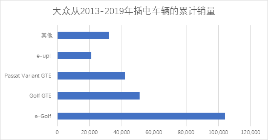 在2013年,大众推出了2014款 e-up!,这算是大众尝试的第一款纯电动汽车,它的电池容量只有18.7kWh。大众品牌(不包含集团的其他车型)截至2019年,全球累计的插电类车辆达到了25万台,其总体分布如下,这款e-Up算是里面销量第四多的车型。(备注:大众的插电车辆增速比较慢,2018年5万台,2019年7万台,如果去掉在中国的量,在欧洲和美国2019年的新能源车不够出彩。)