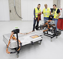 新款的e-up!的电池系统外尺寸轮廓和早期的电池系统是非常相似的,主要是电池单体容量同规格的近乎翻倍了。14个模组的排布方式是,后方共8个模组分上下两排,前面一共6个模组,按照这个尺寸的规格推算,应该是和国内目前的MQB电池包一样用的是390模组。(备注:新款的e-up!还没有开盖的电池系统)