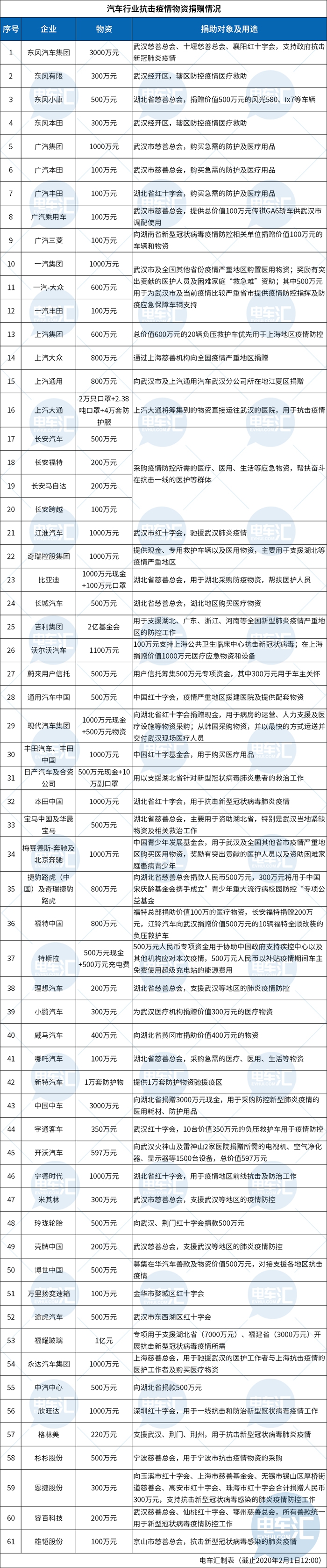 电车汇消息:自武汉新型冠状病毒感染的肺炎疫情爆发以来,举国上下为之牵动。针对新型冠状病毒感染的肺炎疫情,各行各业纷纷为驰援抗疫作出行动,汽车行业的支援行动至今仍在持续,各家企业以自己的方式支持抗疫工作。根据电车汇不完全统计,截至目前,汽车行业累计捐助物资超6.6亿元。