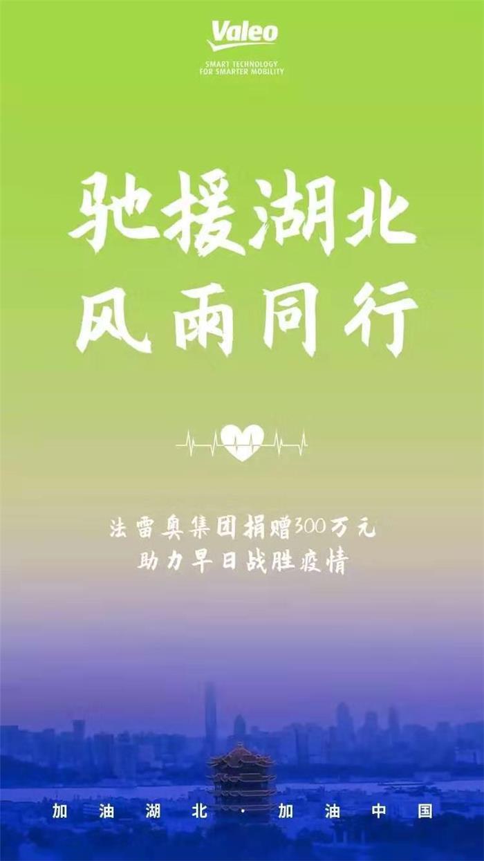1月31日,新型冠状病毒感染的肺炎疫情蔓延,全力防控刻不容缓。面对严峻的防疫形势,社会各界众志成城,为阻击疫情贡献力量。1月31日,法雷奥集团捐赠300万元驰援湖北,助力早日战胜疫情!