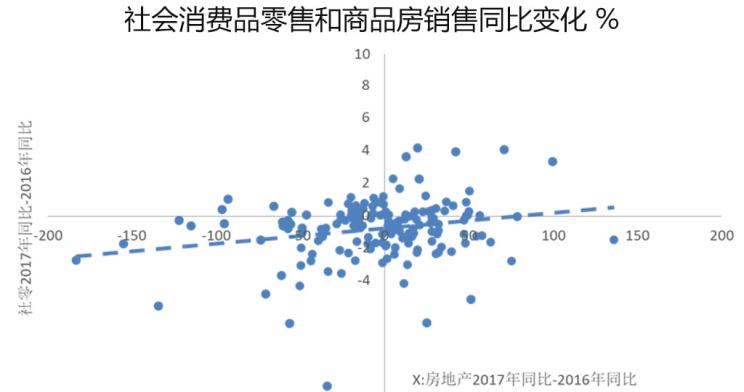 其次,我们把全国160个城市商品房销售的增速和社会消费品零售的增速放在一个散点图上来观察,可以发现:在2017年的横截面上,两者之间表现为显著的正相关关系,这也支持着财富效应的传统看法。