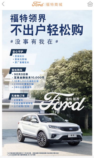 相比大部分车企单一的官方渠道入口,福特领界多平台在线看车选车就显得更便利和快捷。除了福特官网之外,消费者还可以选择福特商城、汽车之家等平台在线看车选车。比如消费者进入线上“福特商城”,通过简单注册,即可在“福特商城”在线看车,了解所有产品的详细信息;而且操作流程极为便捷。这种足不出户也可身临其境的体验,让特殊时期的购车选择变得安全又轻松。